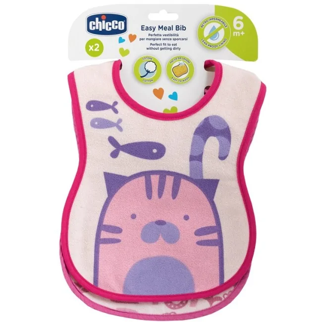 Le bavagline Chicco 6m+ rosa sono un set di due bavaglini pensati per i bambini dai 6 mesi in su, ideali per proteggere i vestiti durante la pappa.