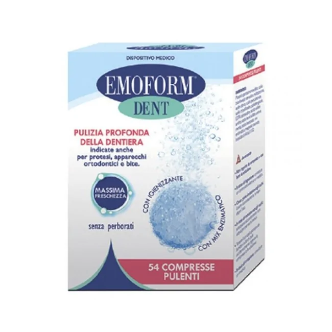 - Emoform dent compresse pulenti per una pulizia profonda della dentiera ( indicata anche per protesi, apparecchi ortodontici e bite).