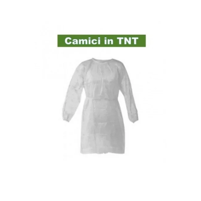 Questi camici sono realizzati in tessuto non tessuto (TNT), un materiale leggero e traspirante. Sono monouso e comodi da indossare.