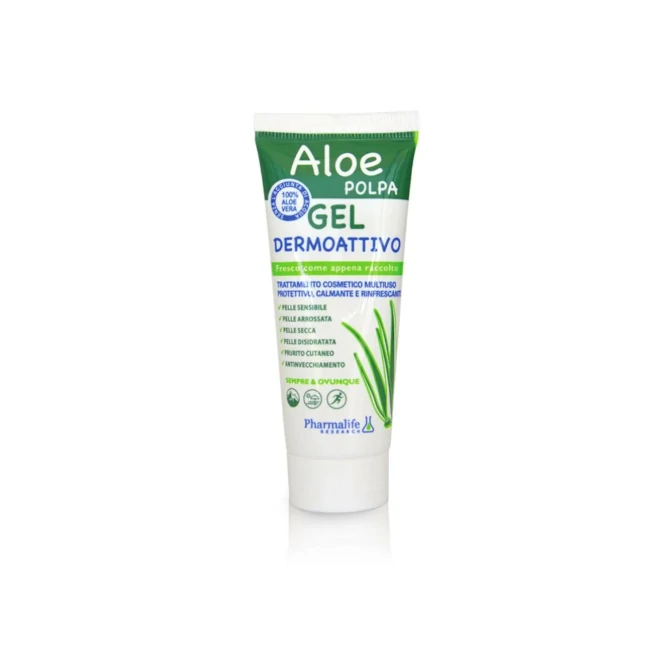 Aloe Polpa Gel Dermoattivo Pharmalife Research: puro succo di Aloe Vera senza acqua, per un'intensa azione lenitiva, rinfrescante e protettiva su scottature e irritazioni. Formato: 100 ml