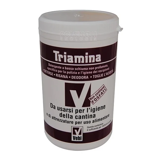 La Triamina 500g è un detergente a bassa schiuma, non profumato, specificamente formulato per la pulizia e l'igiene di tutti i tipi di recipienti utilizzati in enologia. Si tratta di un prodotto professionale, ampiamente utilizzato da viticoltori e produttori di vino per garantire la massima igiene e sanificazione delle attrezzature.