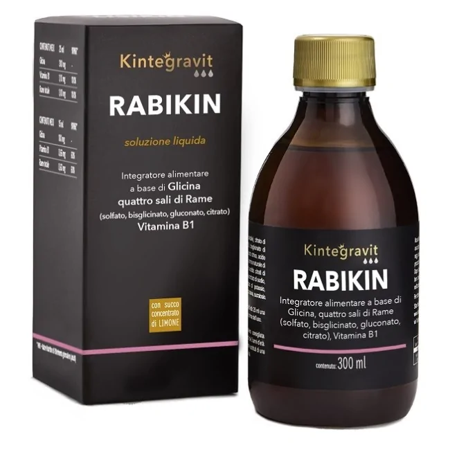 Sitar Kintegravit Rabikin Soluzione è un integratore liquido a base di Glicina, quattro sali di Rame (per il sistema nervoso e immunitario) e Vitamina B1 (per il metabolismo energetico). Senza glutine e lattosio, è indicato per adulti e bambini sopra i 7 anni in caso di aumentato fabbisogno. Formato: 300 ml