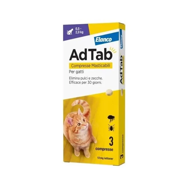 Adtab è un antiparassitario orale per gatti, utile per contrastare pulci e zecche. Formato 3 compresse 12 mg gatti da 0,5 a 2 kg