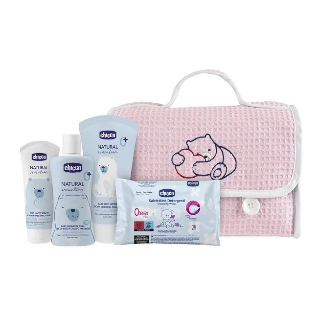 Prezioso beauty case in cotone rosa, realizzato in cotone all'esterno e con tessuto impermeabile all'interno. Contiene tutto quello di cui puoi avere bisogno fuori casa per il cambio il pannolino o per il momento del bagnetto al tuo bambino: 3 prodotti Natural Sensation e le salviette detergenti pocket da 16 pezzi.