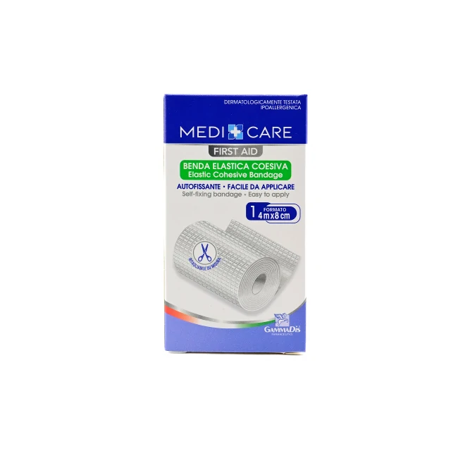 La Benda Coesiva Medicare di Gammadis Farmaceutici (8 cm x 4 m) è una fasciatura elastica autoadesiva e autofissante, progettata per offrire supporto e compressione senza l'uso di fermagli o adesivi sulla pelle.