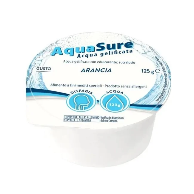 AquaSure è un alimento a fini medici speciali, specificamente formulato per persone con difficoltà di deglutizione (disfagia). Si presenta come un gel morbido e facile da deglutire, con un piacevole gusto all'arancia. Formato: 24 pezzi da 125 grammi