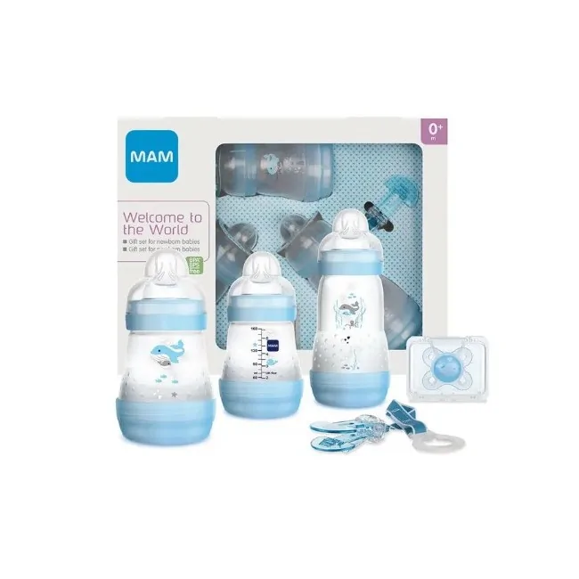 MAM Welcome to the World Kit Nascita Maschio è il set essenziale 0+ contenente biberon Easy Start Anti-Colic auto-sterilizzanti per ridurre le coliche, succhietti e clip. Formato: 1 kit