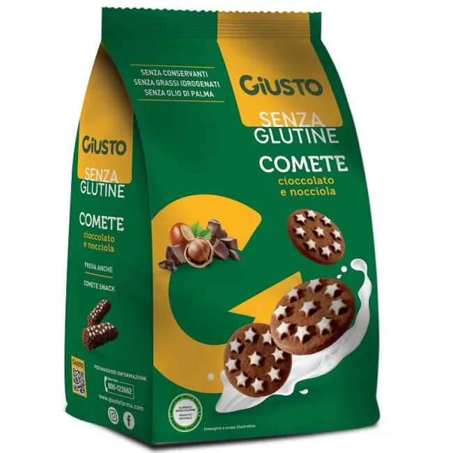 Giusto Comete Biscotti è un alimento senza glutine al cacao e alla nocciola, utile in soggetti con celiachia. Formato: 200 grammi