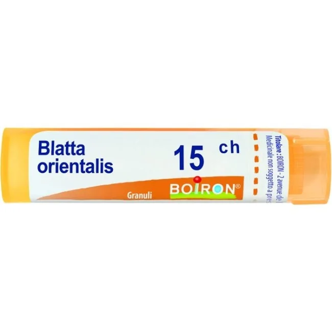 Boiron Blatta Orientalis 15 ch Granuli è un rimedio omeopatico preparato attraverso un processo di diluizione e dinamizzazione, che consiste nel diluire ripetutamente una sostanza di partenza (vegetale, animale o minerale) e nel sottoporla a scuotimenti energici. Questo processo, secondo i principi dell'omeopatia, potenzia l'azione del rimedio.