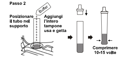 - Preparare il campione come indicato nel foglietto illustrativo: mettere il tubo nel supporto di plastica e versare tutta la soluzione nel tubetto con il fluido orale. Inserire il tappo sul tubetto. Comprimere con delicatezza il tubetto per 10-15 volte per mescolare bene.