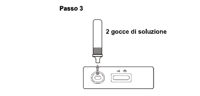 - Rovesciare il tubetto e versare 2 gocce di soluzione nel pozzetto del dispositivo del test e quindi avviare il timer. Non muovere il dispositivo durante l’esecuzione del test.