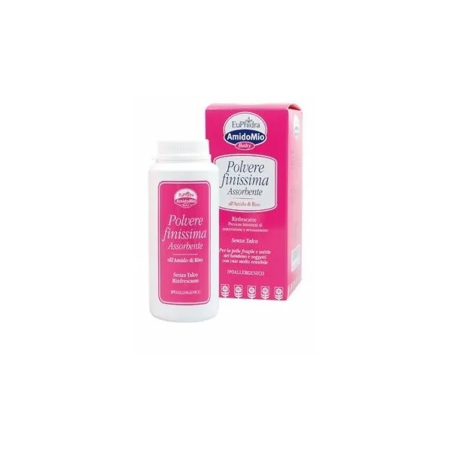 Euphidra Amidomio Polvere finissima dopobagno all'amido di riso puro. Grazie al suo potere assorbente, asciuga e protegge la pelle. Formato 100g