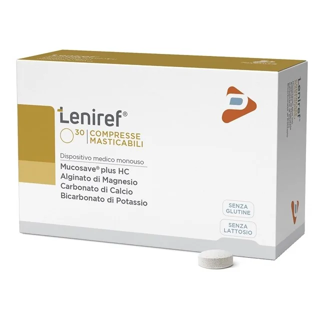 Leniref compresse masticabili è un dispositivo medico indicato per il trattamento del reflusso gastroesofageo e dei sintomi associati come acidità, pirosi e tosse irritativa. Grazie alla sua azione meccanica a base di alginati e carbonati, protegge la mucosa esofagea e blocca la risalita dei succhi gastrici in modo rapido e pratico. Formato: 30 compresse