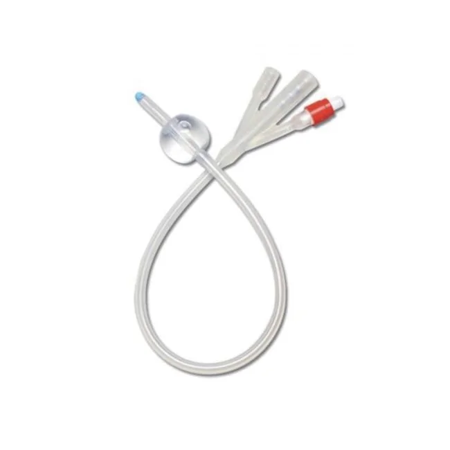 Catetere uretrale Foley a tre vie in puro silicone, misura CH18. Dispositivo monouso e sterile, progettato per il drenaggio urinario a lungo termine. Formato: 1 pezzo