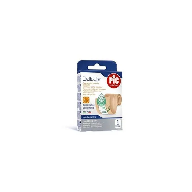 Pic Cerotto In Striscia Delicato con clorexidina gluconato 8x0,5m è una medicazione adesiva sterile con supporto in tessuto non tessuto e un tampone centrale assorbente impregnato di clorexidina gluconato (CHX). Formato: 1 pezzo