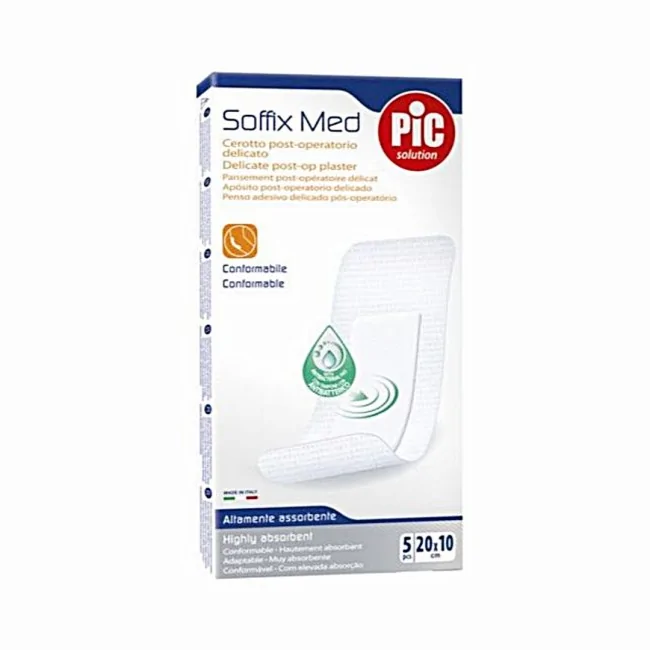 Pic Soffix Med Cerotto con Antibatterico 10x20 5 pezzi sono medicazioni adesive sterili per il post-operatorio, dotate di un tampone centrale assorbente contenente un agente antibatterico (Clorexidina).