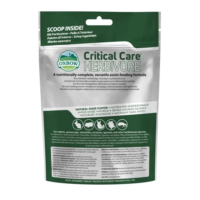 Oxbow Critical Care Herbivore è un mangime nutrizionale completo in polvere, ideale per l'alimentazione assistita di conigli, cavie e altri erbivori malati o convalescenti che hanno perso l'appetito. Formato: 141 grammi