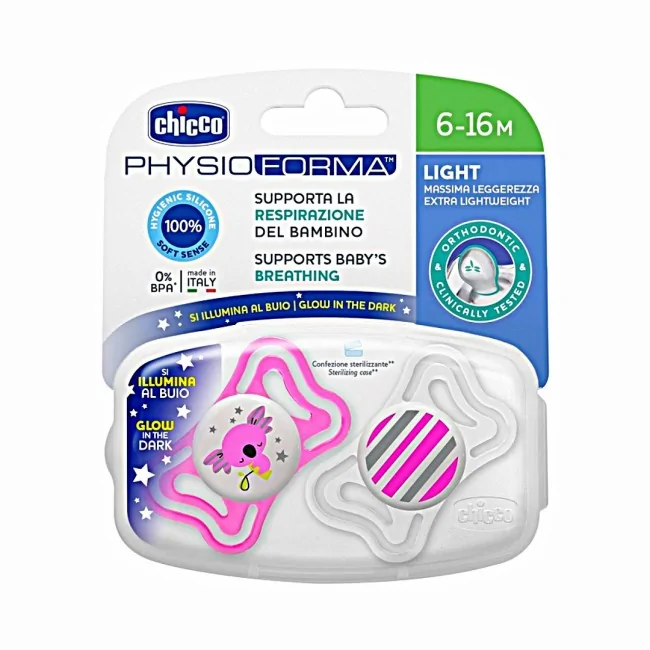 Chicco succhietto light luminoso silicone 6-16 mesi 2 pezzi è pensato per offrire al bambino il massimo comfort. Ideale per migliorare la respirazione e favorire attivamente il corretto sviluppo della bocca del bambino.