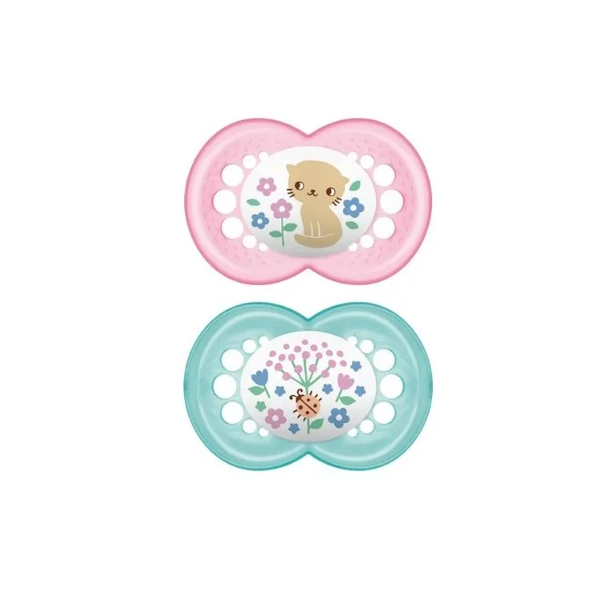 Il MAM Original Ciuccio 6+ Mesi (Femmina) è un bipacco di succhietti ortodontici in silicone SkinSoft. È dimensionato per i bambini più grandi, con mascherina ventilata e cofanetto sterilizzatore incluso. Formato: 2 pezzi