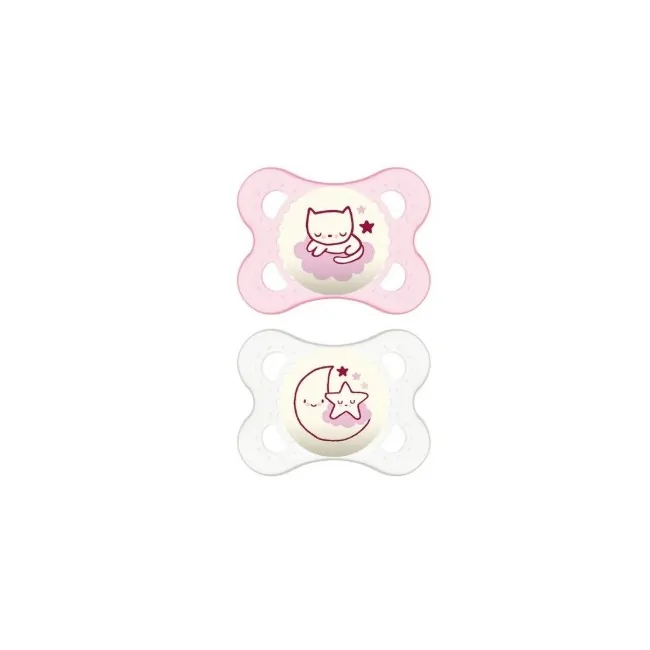 Il MAM Night Ciuccio 2-6 Mesi (Femmina) è un bipacco di succhietti ortodontici in silicone SkinSoft con pomello che si illumina al buio, ideale per i lattanti e per facilitare la ricerca notturna. Formato: 2 pezzi