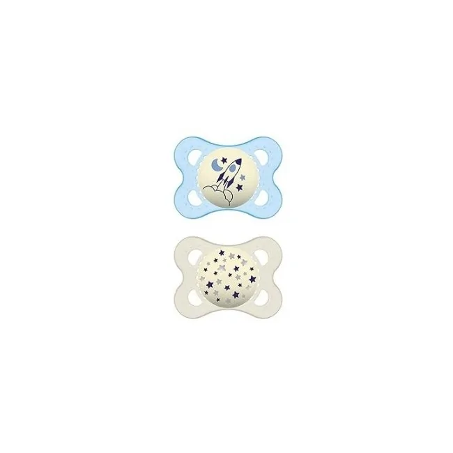 Il MAM Night Ciuccio 2-6 Mesi (Maschio) è un bipacco di succhietti ortodontici in silicone SkinSoft con pomello luminoso. Ideale per i lattanti, facilita la ricerca di notte e include il cofanetto sterilizzatore. Formato: 2 pezzi