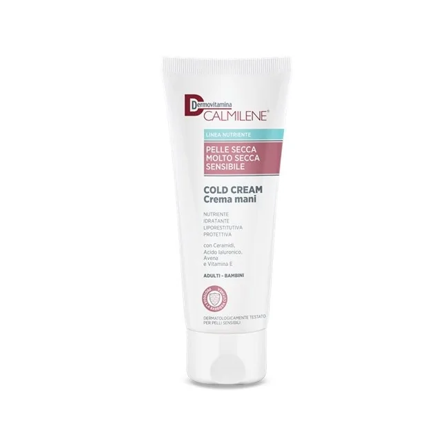 Crema mani nutriente ed idratante. Aiuta a prevenire i danni alla pelle delle mani causati da agenti esterni e a ripristinare la barriera protettiva della pelle. Dona sollievo alle mani secche e screpolate. Dermovitamina Calmilene Cold Cream Crema Mani contiene un complesso di ceramidi che agiscono sinergicamente imitando la struttura lipidica dello strato esterno della pelle, per una maggiore idratazione e protezione ripristinando la barriera cutanea. L'acido Ialuronico assorbe e trattiene l'acqua sulla superficie cutanea, svolgendo un’azione che contrasta la disidratazione e proteggendo la pelle grazie alla sua azione filmante. Il complesso lipidico di avena ripara e rinnova la barriera lipidica della pelle. Infine la vitamina E allevia e ammorbidisce la cute secca e ruvida.
