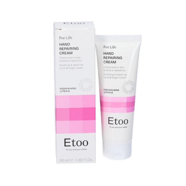 Etoo Hand Repairing Cream è una crema mani lenitiva e riparatrice formulata con Ceramidi e Lutein-Q per idratare, lenire arrossamenti e proteggere i tatuaggi dallo sbiadimento UV. Formato: 50 ml