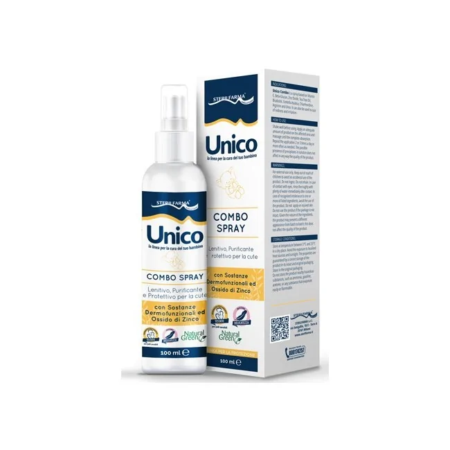 Unico Combo Spray è un dispositivo medico a base di Vitamina E, Betaglucano, Ossido di Zinco, Tea Tree Oil, Bisabololo, Centella Asiatica, Clorexidina, Arginina, Urea, ad azione lenitiva, purificante e protettiva della cute.