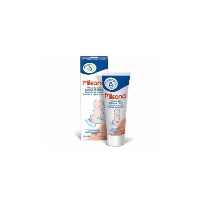 Milsana Pasta Al 50% ossido di zinco, prodotto ad azione lenitiva e rigenerante*. La formulazione a base di ossido di zinco al 50% e di sostanze emollienti lenitive fanno di Milsana® una pasta barriera protettiva, ideale nel trattamento degli stati irritati causati da agenti esterni. Previene e migliora le difese cutanee potenziando i processi riparativi della cute. Grazie alle innovative tecnologie produttive Milsana® si applica con estrema facilità.