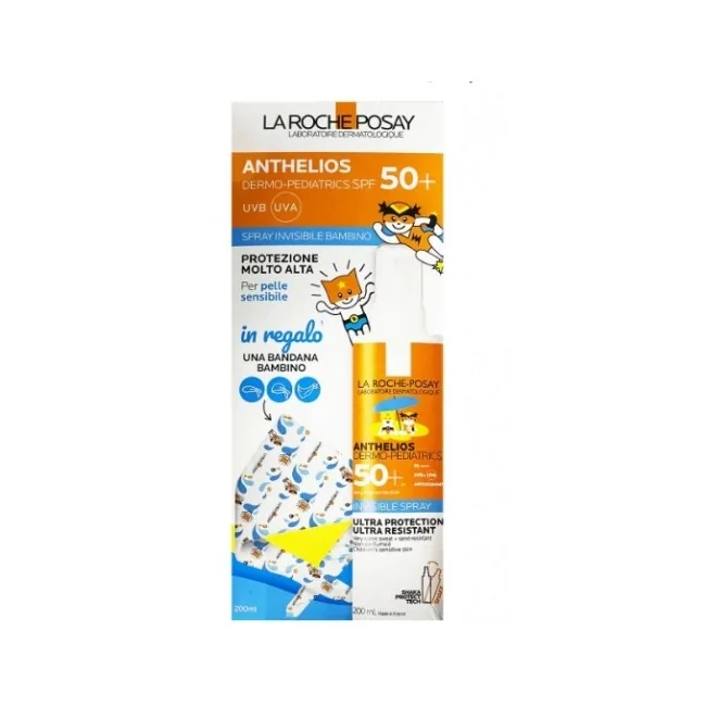 Anthelios spray dermo-ped 50+ è una protezione solare per bambini resistente ad acqua e sabbia con una bandana bambino in omaggio