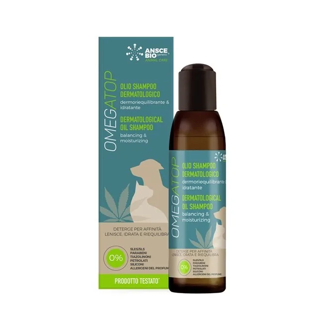 Omegatop olio shampoo è una rmulsione coadiuvante nel trattamento di discomfort cutanei, ad azione dermoriequilibrante e idratante. Deterge per affinità la cute e il mantello, favorendo l'equilibrio del microbiota cutaneo e proteggendo il film idrolipidico. La sua straordinaria formula, a basso potere schiumogeno, combina le proprietà ristrutturanti e idratanti dell'olio di semi di canapa e della ceramide, con l'azione protettiva del piroctone olamina e del tea tree e lenitiva degli estratti vegetali di ginseng, bardana e olio di neem. Adatto per tutti i tipi di cute, anche le più sensibili, dona morbidezza e lucentezza al mantello. Formulato per ridurre al minimo il rischio di allergie. Nichel test (contenuto inferiore a 1 ppm).