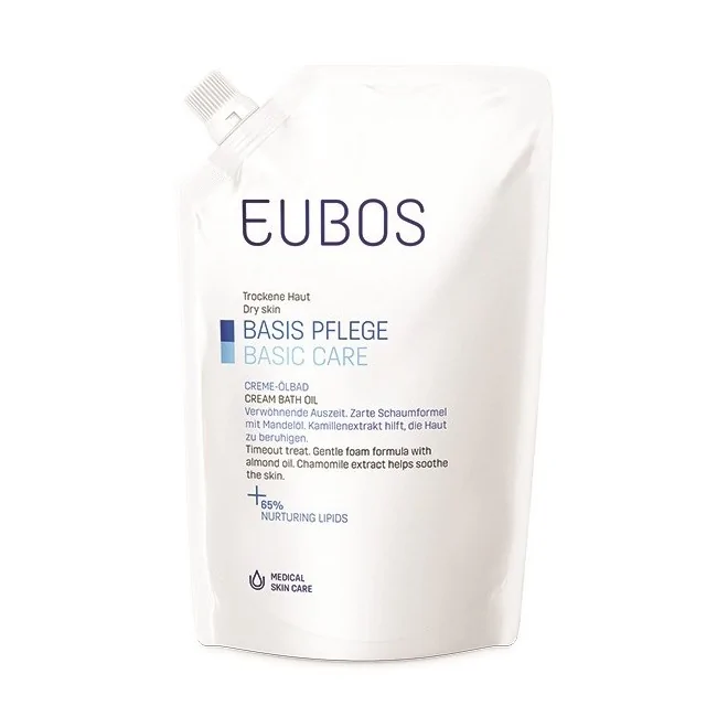 Eubos Olio Bagno concentrato per bagno leggermente schiumoso per pelli secche con azione antipruriginosa. In formato ricarica