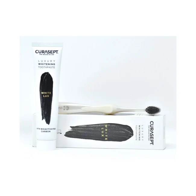 Curasept White Lux Dentifricio e Spazzolino è composto da un dentifricio sbiancante e da uno spazzolino con setole al carbone attivo.