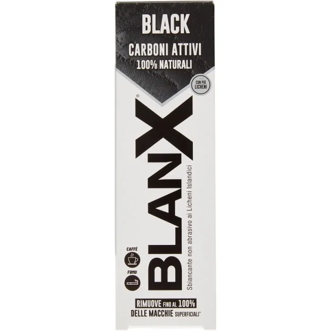 Il Dentifricio Blanx Black Carbone quotidiano a base di licheni islandici e carboni attivi 100% naturali per un bianco autentico e denti senza macchie.
