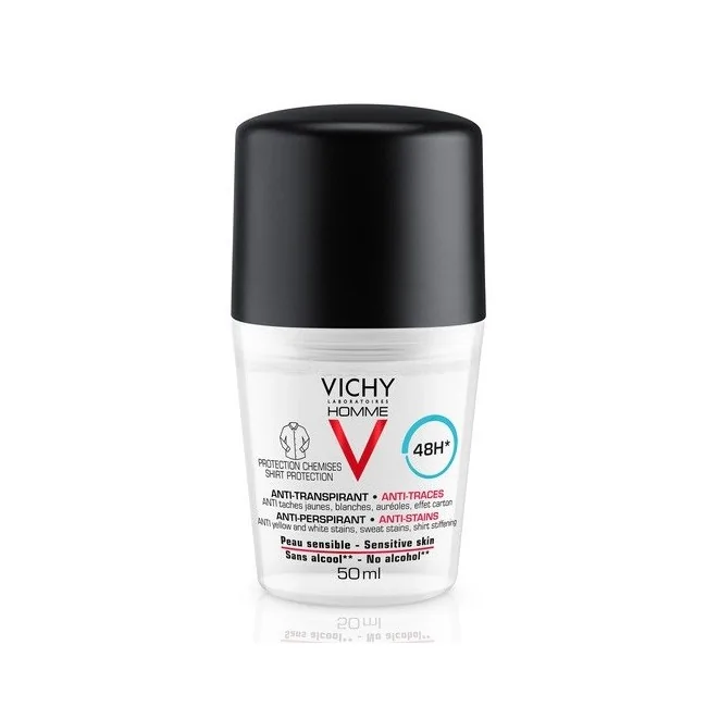 Il deodorante per uomini Vichy è anti-traspirante, anti-macchie, per una sensazione di freschezza di 48 ore (lunga durata).