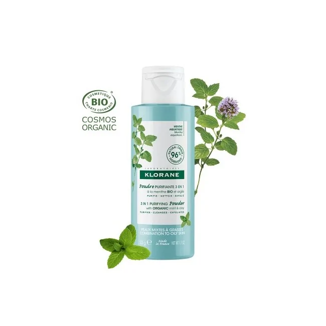 Klorane Polvere purificante menta bio è un detergente per il viso con argilla che purifica ed esfolia la pelle da mista a grassa senza seccarla. Formato: 50 grammi