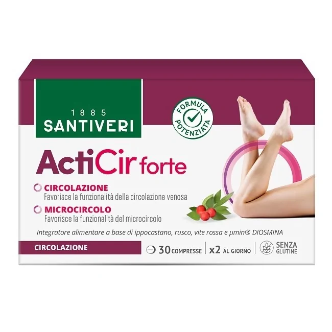 Santiveri Acticir Forte è un integratore con Diosmina, Rusco, Vite Rossa e Ippocastano. Favorisce la circolazione venosa e del microcircolo, riducendo la sensazione di pesantezza delle gambe e coadiuvando la funzionalità del plesso emorroidario. Formato: 30 compresse