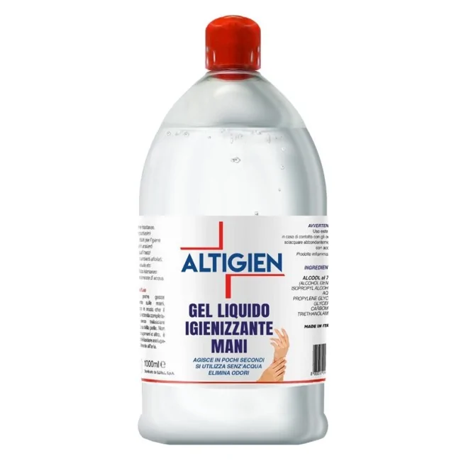 Altigien Igienizzante Mani è un disinfettante con alcool al 70% ad azione rapida e senza risciacquo, in confezione da 1 litro