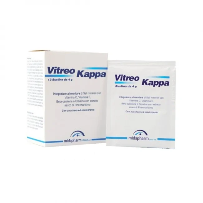 Vitreo Kappa bustine è un integratore alimentare di sali minerali con vitamina C, vitamina E, beta-carotene e creatina con estratto secco di pino marittimo indicato per fornire un apporto supplementare di tali nutrienti in caso di carenza o aumentato fabbisogno.