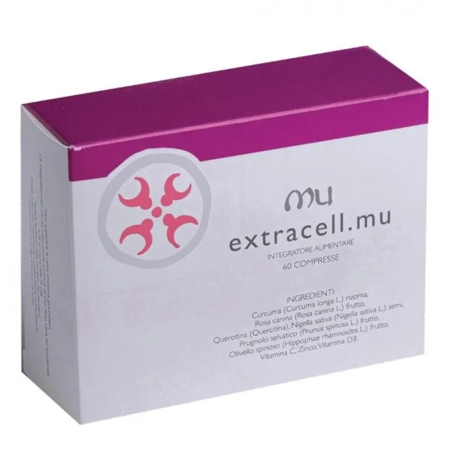 Extracell Mu 60 Compresse è un integratore alimentare a base di vitamine ed estratti naturali, commercializzato per sostenere il sistema immunitario e la salute generale dell'organismo.