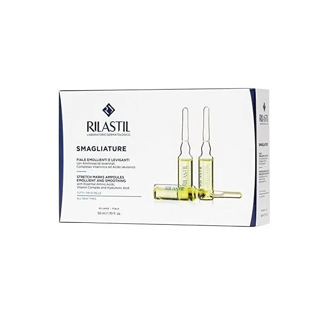 Rilastil Smagliature è un trattamento intensivo ad azione urto specificamente indicato per aiutare ad attenuare e prevenire le smagliature. La sua formula concentrata, contenuta in pratiche fiale monodose, è studiata per migliorare l'elasticità e la tonicità della pelle. Formato: 10 Fiale da 5 ml