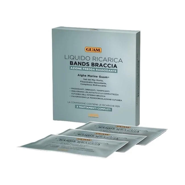 Liquido di ricarica per Guam Bands Braccia con azione fredda rassodante e snellente. Contiene Alghe Marine Guam e principi attivi che contrastano il rilassamento cutaneo. Formato: 3 buste 45 ml