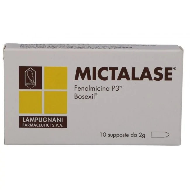 Mictalase Supposte è un dispositivo medico a base di Fenolmicina P3® e Boisexil®, indicato nelle affezioni genito-urinarie e ano-rettali associate ad elementi infettivi e spasmodici.