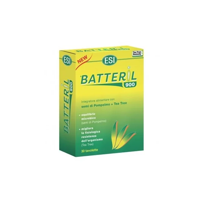 Esi Batteril 900 integratore alimentare a base di estratto di semi di pompelmo e olio essenziale di tea tree, utile per contrastare le più comuni infezioni. I principi contenuti sono dotati di attività antibatterica, antivirale, antimicotica e antiparassitaria. Il prodotto trova applicazione nei casi di bronchite, influenza, cistite, nevrite, candidosi ed altri tipi di infezione. Non contiene: glutine, zuccheri aggiunti, conservanti aggiunti, coloranti artificiali.