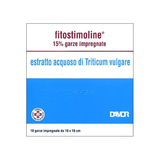 Fitostimoline Garze impregnate Ogni garza è impregnata a saturazione con 4 g di crema contenente, in 100 g, il seguente principio attivo: estratto acquoso di Triticum vulgare (residuo secco pari a 200 mg/100 ml) 15 g. Per l’elenco completo degli eccipienti, vedere paragrafo 6.1