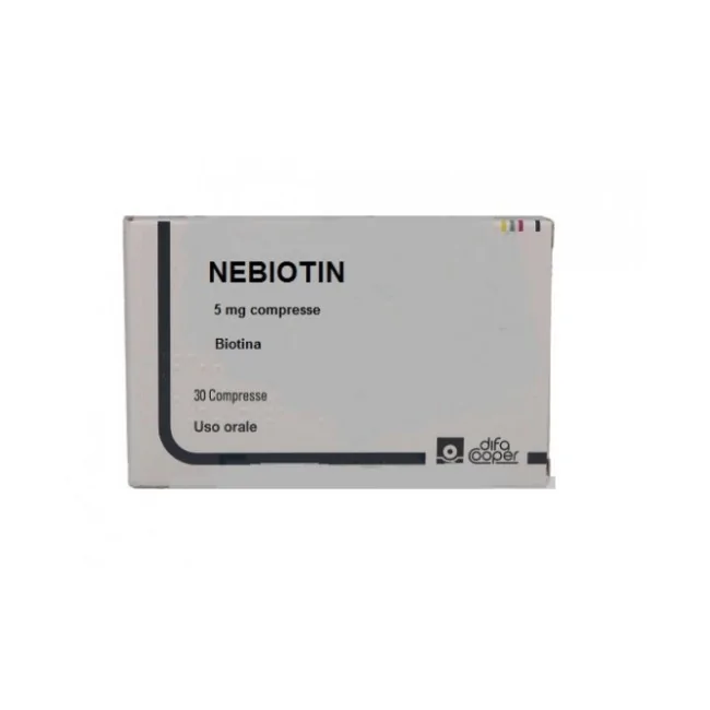 Nebiotin 5 Mg è un farmaco a base di Biotina (Vitamina B7 o H), indicato per il trattamento delle carenze di questa vitamina. È utile per il benessere di pelle, capelli e sistema nervoso, e nel metabolismo di grassi, carboidrati e aminoacidi. Formato: 30 compresse