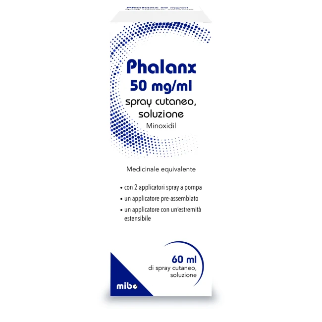 Posologia Applicare 1 ml di Phalanx 50 mg/ml due volte al giorno (mattino e sera) sulle zone interessate del cuoio capelluto. La quantità applicata quotidianamente, ovvero 2 x 1 ml di soluzione, non deve essere superata, indipendentemente dalla dimensione dell’area del cuoio capelluto interessata. Popolazione pediatrica di età inferiore a 18 anni e pazienti dai 65 anni in su Phalanx 50 mg/ml non deve essere usato in questi gruppi di pazienti, poiché non sono disponibili risultati di efficacia e sicurezza derivati da studi controllati in questi gruppi di età. Donne Per le donne, è disponibile Phalanx 20 mg/ml. Modo di somministrazione Uso cutaneo. Prima di applicare Phalanx 50 mg/ml ci si deve assicurare che il cuoio capelluto sia asciutto. Phalanx 50 mg/ml non deve essere applicato in altre parti del corpo. Lavare scrupolosamente le mani dopo l’applicazione di Phalanx 50 mg/ml, per evitare il contatto accidentale con mucose e occhi. Dopo l’applicazione di Phalanx 50 mg/ml, i capelli possono essere acconciati come di consueto. Tuttavia, il cuoio capelluto non deve essere bagnato per circa 4 ore. Questo impedirà che Phalanx 50 mg/ml venga lavato via. Ogni flacone di Phalanx 50 mg/ml contiene 2 differenti applicatori spray a pompa: - Un applicatore pre-assemblato per l’applicazione su un’area estesa - Un applicatore a parte con una estremità allungata per aree più piccole Entrambi gli applicatori possono essere scambiati staccando un applicatore e sostituendolo con l’altro. Per una dose di 1 ml, sono necessarie 6 erogazioni dello spray. Istruzioni per l’uso/applicazione La soluzione è spruzzata direttamente sul cuoio capelluto nell’area della perdita dei capelli. Per fare ciò, premere la pompa 6 volte. Dopo ogni applicazione, il liquido deve essere distribuito sull’area interessata con la punta delle dita, evitando così l’inalazione della nebulizzazione. Durata d’uso L’insorgenza e l’estensione della crescita dei capelli differiscono nei singoli pazienti. In generale, è richiesto un trattamento effettuato 2 volte al giorno per 2-4 mesi prima di prima di poter vedere un effetto. Per mantenere l’effetto, si raccomanda di continuare con 2 applicazioni al giorno, senza interruzioni. Non saranno ottenuti risultati migliori applicando quantità maggiori di Phalanx 50 mg/ml oppure applicandolo più frequentemente. Riguardo il possibile effetto terapeutico, c’è sufficiente esperienza clinica per un periodo di trattamento fino a 1 anno. Se non si ottiene un effetto dopo 4 mesi, il trattamento deve essere sospeso. Dosaggio troppo basso Se viene applicata una quantità troppo ridotta di Phalanx 50 mg/ml o se una dose viene dimenticata, l’utilizzatore non deve compensare la dose dimenticata. In questo caso, si deve continuare il trattamento con la dose raccomandata.