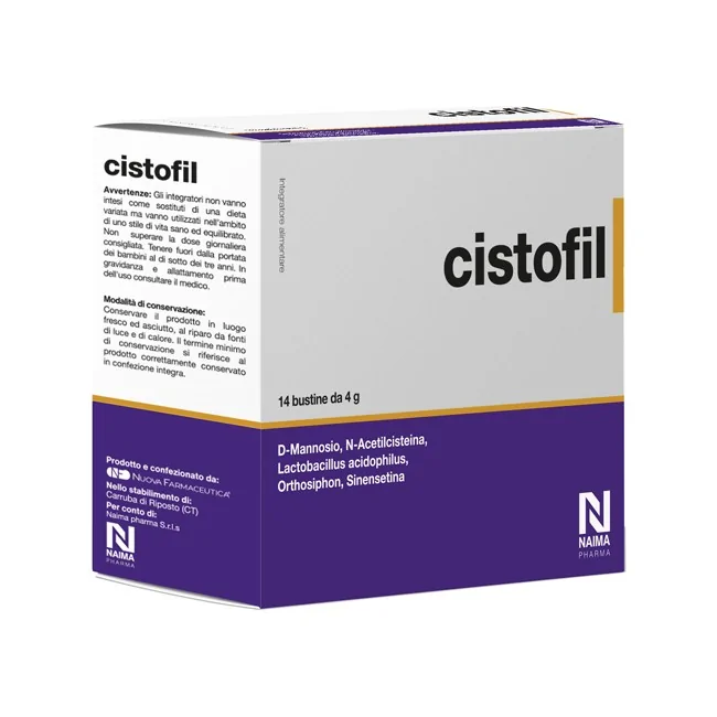 Nutraceutico contenente D-mannosio che riduce l'adesività batterica, venendo così utilizzato per combattere la fase acute della cistite, nel trattamento della batteriuria asintomatica e nella prevenzione della cistite batterica e post coitale. Il lactobacillus acidophilus produce due potenti antibiotici naturali efficaci per eliminare parecchi batteri patogeni, tra i quali escerichia coli, maggiormente coinvolto nelle cistiti, la sinensetina invece funge da diuretico alleviando così i dolori e i fastidi durante la minzione causate dall'infezione. La NAC contenuta in Cistofil invece, disgrega il biofilm batterico eliminandone o riducendone la cronicità.