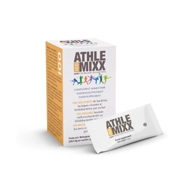 Athlemixx 100 miliardi è un integratore alimentare a base di 100 miliardi di batteri lattici e bifidobatteri vivi per bustina.