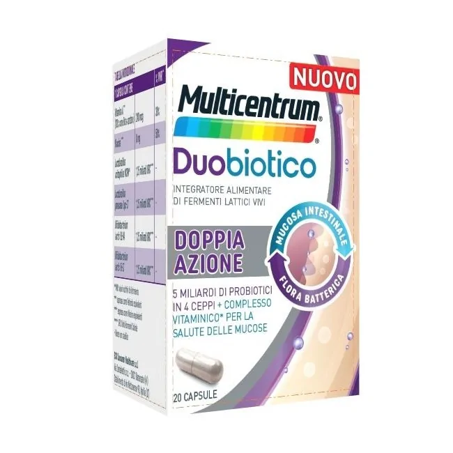 Multicentrum Duobiotico capsule è un integratore alimentare a base di fermenti lattici vivi con complesso vitaminico a doppia azione specificamente formulato per favorire l'equilibrio della flora e il benessere della mucosa intestinale.